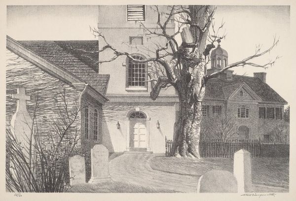 Editor: This print, an etching actually, is titled "West Entrance of the Field Museum" by Beatrice S. Levy. It looks like a bleak winter scene. The museum is grand but feels distant through the screen of bare trees. What significance do you see in depicting a public institution this way? Curator: It's interesting you call it bleak. I think Levy’s choice to represent the Field Museum in this particular state offers commentary on the institution's role within the broader social landscape of its time. The etching technique, with its emphasis on line and shadow, reinforces the monumental architecture, yet also sets up a contrast, wouldn’t you agree, with the natural, almost fragile forms of the trees. Editor: Definitely! The way the spindly branches obscure parts of the building almost makes the museum seem inaccessible. How did institutions like the Field Museum see their place in society back then, and how might this etching be playing with that image? Curator: Well, the early 20th century saw museums positioning themselves as educational and cultural hubs, striving for a sense of democratization of knowledge. But institutions also battled for funding and public interest, and were always making claims of scientific and social authority. Levy's print acknowledges that tension, hinting at how institutions presented themselves versus their actual accessibility and perceived relevance for different societal groups. Are the trees protective or concealing? Are they nature's filter? It begs that question. Editor: So, the print is not just a landscape, but a commentary on the museum’s projected image? Curator: Precisely. And perhaps a reflection on the artist’s own complex relationship with institutions of knowledge and culture. Art is never made in a vacuum, and the artist's choices reflect these debates. Editor: That gives me a whole new way to appreciate what's going on here, beyond just the beauty of the lines. It really helps contextualize the image. Curator: I'm glad to offer this additional layer, that's why History and visual literacy go hand-in-hand.