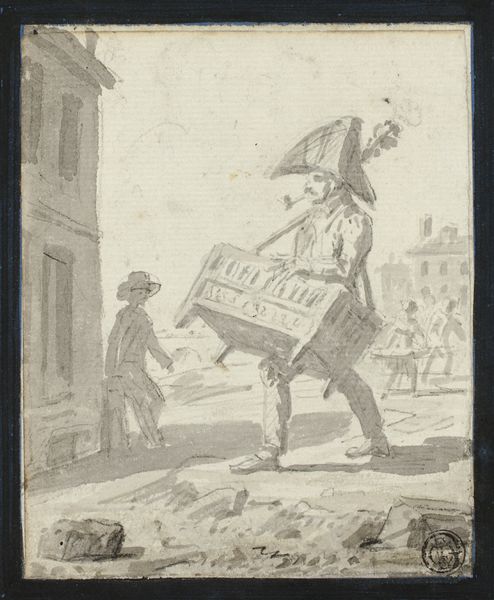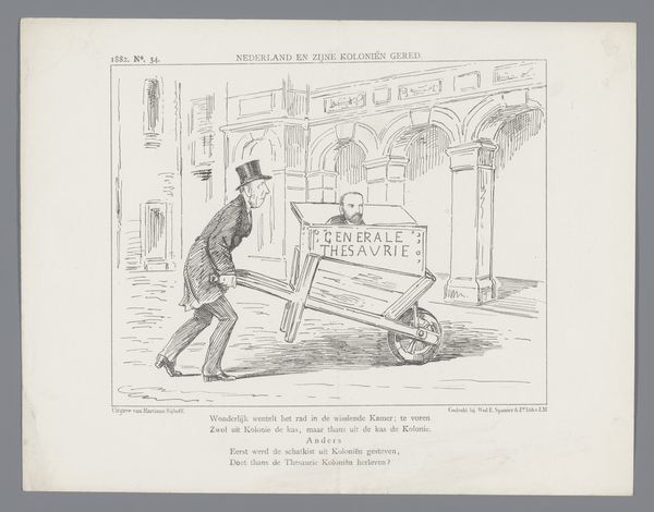 This is a print made in 1874 by Johan Michaël Schmidt Crans, titled 'Spotprent op de Amsterdamse kieverenigingen'. The print offers a glimpse into the political and social dynamics of 19th-century Amsterdam. It features two men carrying a banner that reads "Politiek naar voorschrift, Burger-Powet". We can interpret this as a commentary on the state of politics. The artist critiques how politics is conducted according to rigid rules, perhaps at the expense of citizen power, ‘Burger Powet’. The artist uses satire to address the relationship between the individual and the political structures of his time. Crans encourages the viewer to question the balance of power and the role of the citizen in shaping political discourse. The print serves as a visual record of the artist’s stance on the political climate, reflecting both the societal concerns and personal emotions tied to civic engagement.