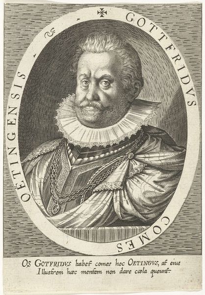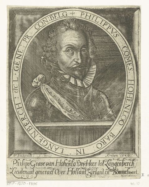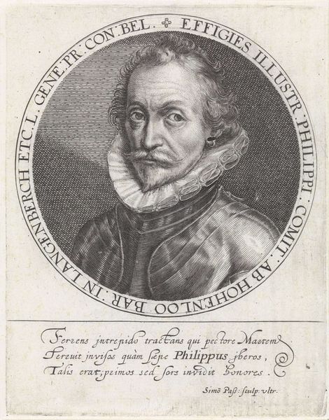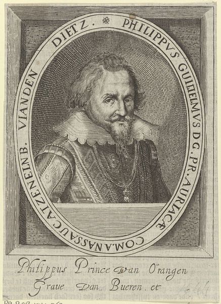 This is an engraving of Ernst Casimir, Count of Nassau-Dietz, made by an anonymous artist. During the 17th century, portraiture was more than mere representation; it was a declaration of status and power. Casimir, encased in armor and encircled by his titles, embodies the expectations of his class. Yet, look closer at the image; there's a human quality that transcends the formal representation. His eyes, though fixed, seem to carry a trace of vulnerability. Consider how the weight of leadership and lineage might shape a person's identity. Does this portrait capture the man, or the myth? It invites us to reflect on the tension between public persona and private self. The artist compels us to see beyond the trappings of nobility and connect with the individual within.