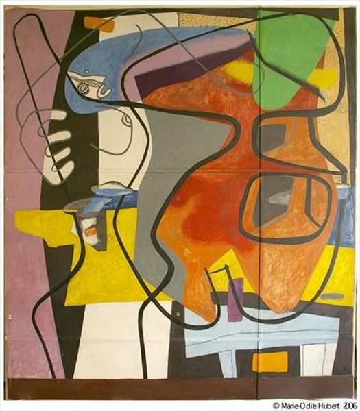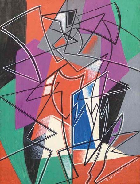 Editor: So here we have Gino Severini's "Ballerina," created in 1954, a painting employing acrylics. It's certainly… striking in its geometric abstraction. What's particularly interesting to me is how Severini has fractured the image. What do you make of it? Curator: What I immediately see is a fascinating dialogue between representation and abstraction rooted in its production. The "Ballerina," a subject laden with cultural significance in the 20th century, has been fractured, almost deconstructed by the artist, so you see here that Severini moved past representation, almost like he dissected the material elements which shaped the dance and dancers. Editor: Dissected? What do you mean by dissected? Curator: The canvas becomes almost a space of dissection. Rather than simply depicting the figure, the application of acrylic, the act of painting, become almost performative acts akin to the dancer's labor, deconstructing ideas about artistry and feminine labor. How does this approach challenge the conventional ideas associated with painting and ballerinas? Editor: I hadn’t thought of the acrylic itself playing a role, but framing it that way really shifts how you interpret its meaning. The medium then becomes an active agent in the artwork, which allows me to see what Severini’s focus may have been, even. Curator: Precisely. It underscores the material conditions and challenges assumptions regarding beauty. Thinking about how this might apply to other works could really alter perceptions of paintings. Editor: Definitely, it gives a new perspective that really changes what I focus on, when visiting an exhibition.