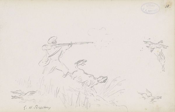 Friedrich Wilhelm Hirt’s “Shooting Hunter to the Right” captures a figure in action using graphite pencil on paper. The starkness of the medium influences the work's raw appearance; you can see every stroke, every erasure, emphasizing its status as a study rather than a finished piece. The texture of the paper itself adds another layer to the work’s materiality, contrasting with the smooth lines of the hunter’s pose. Hirt likely engaged with traditional sketching techniques, honing skills through countless preliminary drawings. But here, the absence of detail throws the work into an interesting space. The focus shifts from idealized representation to the act of hunting itself. We might consider the labor involved in hunting, and perhaps also how a sketch like this relates to the larger economic activities of the time. Paying attention to materials, making, and context enriches our experience, allowing us to appreciate the layers of history embedded within it.