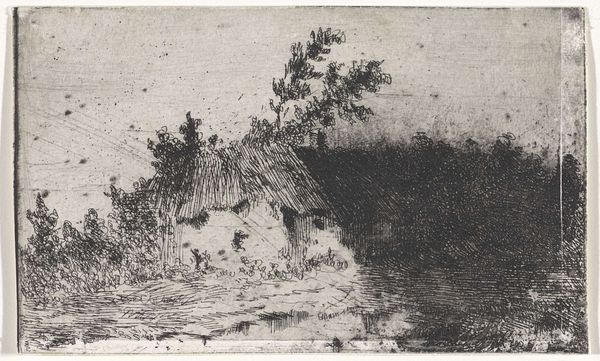 Curator: Before us we have "Hut met rieten dak," or "Hut with a thatched roof," a landscape rendered in ink, etching, drawing, and printmaking, dating from 1831 to 1904, by Arnoud Schaepkens. What's your initial reaction to it? Editor: Bleak. The contrast is striking; there are hardly any mid-tones, so we have these stark black lines that define a very solitary and, frankly, rather dismal-looking dwelling. It speaks volumes about the social conditions of the time; these were likely very difficult lives for those who occupied such dwellings. Curator: The etching technique certainly contributes to the starkness. Notice the density and directionality of the lines used to create form and shadow. The thatching on the roof, for instance, is described with incredibly precise, parallel strokes. Also, the tree almost merges into the building creating visual unity in their similar linear designs. Editor: It's not merely about skillful representation. The way the hut almost melts into its surroundings can be interpreted as the limited access and marginalization experienced by those who resided here; blending with the environment could mean invisibility within the social hierarchy. Curator: A valid point. However, from a formal perspective, it might simply be an aesthetic choice. The artist may have aimed to harmonize architecture with nature. Look at how the reflections in the water mirror the rough texture of the foliage, creating visual echoes. Editor: Perhaps, but I think there's also the narrative. I am drawn to what these stark contrasts convey in regards to access. Did it reflect something larger about land rights or ownership patterns within 19th-century society? Where was this even located? Curator: Unfortunately, its exact original location is unrecorded. Its power is indeed its evocative use of line and form. Schaepkens’s choice of monochromatic palette, the stark contrast, allows the composition to speak clearly and directly. Editor: Precisely. And that directness, for me, underscores a rawness about life that art often softens, bringing viewers in to connect and also grapple with discomforts. Curator: True. Ultimately, "Hut met rieten dak" invites viewers to contemplate both the technical artistry and its complex historical and societal interpretations. Editor: It is an illustration and, at the same time, an illumination of complex power relations.