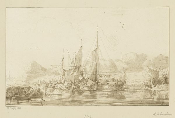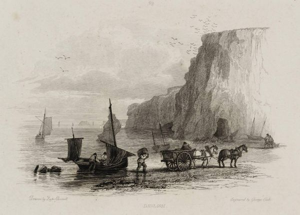 Curator: This is "The Beach at Hastings, Looking East" by Luke Clennell. Clennell was born in 1781 and passed away in 1840. It is part of the Tate Collection. Editor: It evokes a sense of bustling activity, doesn’t it? The details are captivating. Curator: Indeed. Clennell’s work often depicted scenes of everyday life. Hastings was becoming an increasingly important seaside resort at this time, and his composition illustrates the social transformations of the period. Editor: I'm drawn to the prominence of the boats. They seem to symbolize both adventure and the economic lifeblood of the community. Curator: Precisely. He captures the essence of a working port adapting to new social rituals around leisure. The figures on horseback mingle with those disembarking from boats, demonstrating social fluidity. Editor: It's all so meticulously rendered. Even the dog seems to have its own story. What a time capsule! Curator: It’s a fascinating window into the past. Clennell allows us to observe the intersections between social and economic life during this historical moment. Editor: Absolutely, it is the symbolic language of everyday life. I am really glad to have seen this piece.