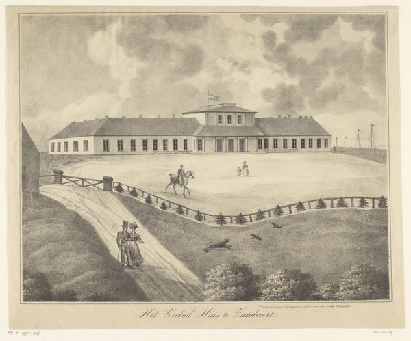 E. Huygens’ drawing depicts the Bad Hotel in Scheveningen with understated precision, placing emphasis on the building's imposing presence above a lively beach scene. The hotel itself is presented as a beacon of civilization. The building's architecture is reminiscent of classical temples, embodying ideals of order and refinement. Compare this with depictions of temples throughout history, from ancient Greece to the Renaissance. See how they served as symbols of cultural ambition and societal values. This architectural style, evoking a sense of permanence, contrasts with the dynamic, ever-changing nature of the sea. It's a juxtaposition that reveals a timeless aspiration to shape and control the environment, mirroring humanity's persistent quest for stability amidst life's inherent flux. Notice the human figures scattered along the shoreline; their activities suggest leisure and a connection with nature, yet they are dwarfed by the scale of the hotel, reinforcing its dominance. This image encapsulates a pivotal moment where built structures begin to assert control over natural landscapes, reflecting a deeper cultural shift towards urbanization.