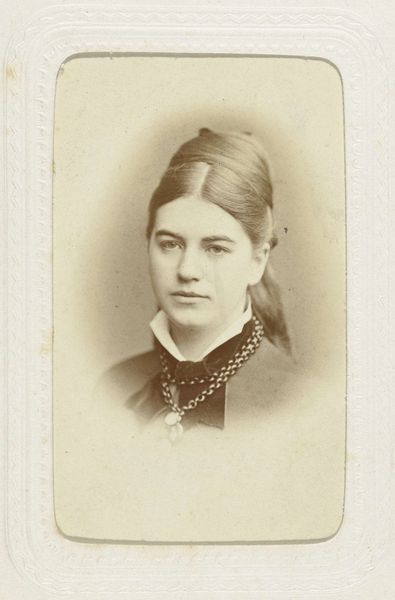 Editor: Here we have a card, circa 1880s, titled "Mrs. Cleveland." It was created by W. Duke, Sons & Co. as part of the Actors and Actresses series using albumen-print photography. It’s small, like a playing card. What can we say about this object as an artifact of its time? Curator: Well, first off, the Duke company wasn’t making art. They were in the business of mass-producing cigarettes. The card itself is less about Mrs. Cleveland and more about using her image to sell a product. What was the purpose and the cost to produce something like this in the 1880s, considering material value? Editor: So the albumen print, that specific photographic process, it’s part of this whole system of production? How does the process itself shape the final image and its meaning? Curator: Exactly! Albumen prints were relatively cheap to produce, which made mass production like this possible. Consider the labor involved, the materials sourced—this isn't just a portrait; it’s a product of industrial capitalism, using Mrs. Cleveland's fame to fuel consumerism. Look how “Duke Cigarettes are the best” are literally on top of her head, branding the sitter. Editor: It’s interesting how the cigarette company used the likeness of a celebrity to promote a mass-produced commodity. This recontextualizes portraiture to one of mere trading cards to be consumed by all. Curator: Yes. It's a stark contrast to traditional portraiture. The materiality and method of production of the print democratizes portraiture into affordable photographs to be collected and traded in exchange for boosting Duke’s branding and selling tobacco products. Where can the line between art and a commodity for trading be drawn? Editor: That definitely changes how I view this “portrait.” I never considered how the cigarette industry and photographic processes of the time could intersect in such a revealing way. Curator: Right. Analyzing art through the lens of production really opens up a new way of appreciating the relationship between art, society, and industry.