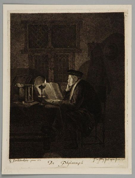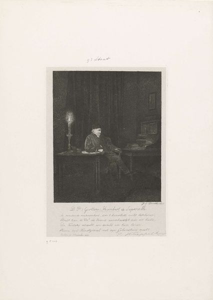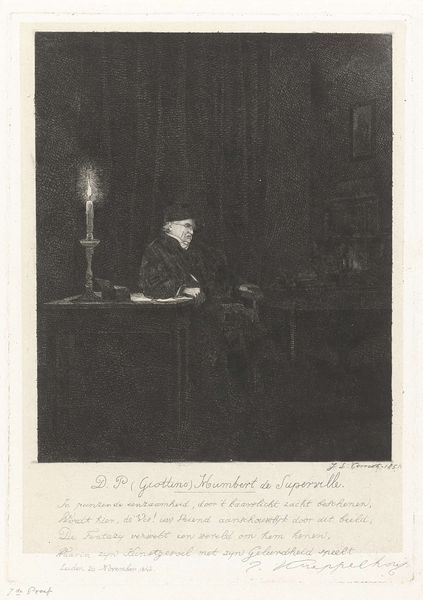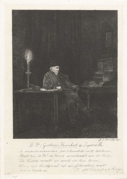 Curator: Here we have Jacobus Ludovicus Cornet’s “Portret van Humbert de Superville,” created in 1851. It’s an etching, currently held here at the Rijksmuseum. Editor: Immediately, I'm struck by the use of light and shadow, and the contrast, it lends the piece an air of somber intensity and mystery. Curator: The etching technique itself—the physical labor of creating such fine lines—speaks volumes. Consider the social context: prints made art accessible. Who was this Humbert de Superville and how was his likeness consumed? Etchings democratized art, but also reproduced social hierarchies. Editor: Absolutely. And formal elements underscore this point. The lines build to a focal point, primarily around the figure's face, highlighting the subject's character or perceived importance. The texture—so crucial with etching— adds richness. How would you read the artist's intention with his choice of etching and what can be understood of its reception? Curator: That is fascinating when you think about its function within a print market, though. We could spend a lot of time asking how a proliferation of his image through printed matter supported both an economic model and reinforced societal power structures of the period. Were these prints available to be purchased in the shop down the road? Editor: Undoubtedly the texture enhances its gravitas, lending both volume and character. Consider the depth produced via varied densities of lines – the artist's hand has deftly animated this interior scene through gradations and tone. I sense a carefully calibrated composition intended to produce a visual narrative. Curator: Let's not forget the material cost, though. Etching involves acids, metal plates… This art isn’t magically born, it is created. Each choice speaks to social conditions for producing and distributing artwork. Editor: Precisely, the materiality infuses its aesthetic. When light plays off the etching it offers visual interest. Its structural forms allow for a story to take shape, wouldn't you say? Curator: From that perspective, each of our ways of seeing adds another vital piece. Understanding both social history and the formal components enrich our perception greatly. Editor: Agreed, exploring materiality through light, shadow and artistic structure builds our own interpretation, one informed by thoughtful contemplation.