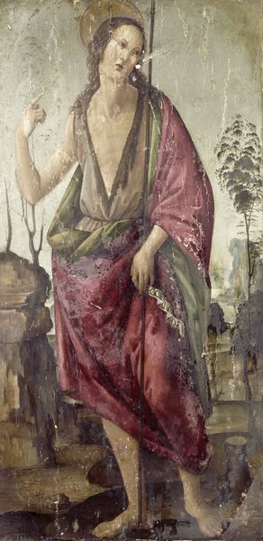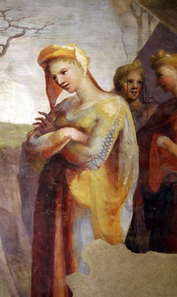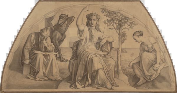 Curator: This is Philipp Veit’s "Italia," painted between 1834 and 1836. It’s a fresco, now residing in the Städel Museum. Editor: It’s…melancholy. The figure, draped in these striking colours, is seated but doesn’t strike a pose of strength or triumph. More like…resignation? The rough stone at her feet hints at decay. Curator: Yes, "Italia" is an allegory, a symbolic representation of Italy itself. Veit painted this during a period of political fragmentation and foreign domination, a time when the dream of a unified Italy seemed distant. It's important to understand that Veit and many of his contemporaries belonged to a movement attempting to rekindle cultural nationalism. Editor: You see it in the deliberate classicism—the draped figure, the laurel wreath. But I can't help but think about the labor involved in creating this fresco. Consider the physical effort of applying the pigments to wet plaster, the cost of materials and manufacture involved in creating a grand allegorical artwork. It is the kind of labour for grand narratives. Curator: Absolutely, that’s a key aspect. The artwork's very style signals a return to idealized forms, echoing ancient Rome to inspire contemporary viewers. Editor: The setting is almost operatic. The background almost upstages the woman. But I am left to ponder how such representations shaped the socio-political landscape in real ways and not just through idealism. These nationalist sentiments fed directly into policies and politics of the 19th and 20th century. Curator: And look closely. The apple tree bursting with fruit is juxtaposed with those stark, structural plants beneath her. The contrast suggests both the potential of Italy, the ripeness waiting to be harvested and the prickly conditions and realities on the ground. Editor: Looking again I notice she is sitting. This feels meaningful somehow. Instead of being a picture of power, her resignation might convey some hope of power at rest or perhaps her expectation. Curator: Ultimately, "Italia" invites reflection on Italy’s past glories and its unrealized aspirations, reflecting the political and cultural anxieties of its time. Editor: Seeing "Italia" prompts me to consider both the artifice and the genuine hope embedded in these nationalistic images, urging to consider both the process and effects.