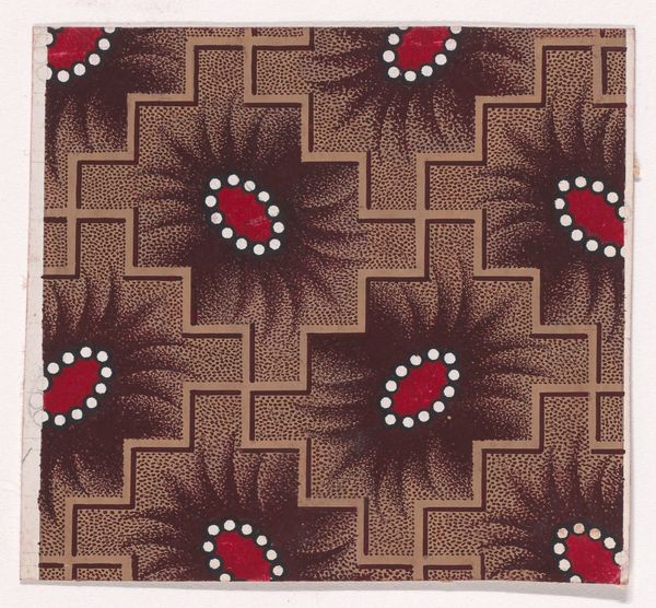 Editor: Here we have a textile design from 1840, called "Textile Design with Vertical Vermicular Strips of Pearls Separated by Chevron Stripes", and its creator is unknown. It’s a drawing, maybe for a print? I am fascinated by the density of detail, and the brown, red and white palette create a surprising warmth. What strikes you about it? Curator: The title itself is fascinating, isn't it? Sounds like someone having a bit of a lark. Vermicular strips of pearls... chevron stripes! Delicious. Beyond the whimsy, though, I see a tension between order and chaos. The repeating pattern speaks to the human desire for structure and predictability, which I sometimes crave with my scattered brain, whilst the slightly irregular execution, especially within those pearl-like forms, hints at a more organic, free-flowing energy. Makes you wonder, doesn't it, if this was meant for clothing, wallpaper, or some other decorative purpose? Where might we see this pattern repeated? Editor: It’s funny you mention that chaos, because despite being very decorative, I find its muted color a bit serious, in contrast to a cheerful design. It is as if the author was uncertain. Also, about its usage, how do you imagine people perceived patterns like this back in 1840? Curator: That’s a spot-on observation! The somber color might point toward specific aesthetic trends of that time. It's important to think about the intended audience – imagine it in a dimly lit Victorian parlor, contrasting with the dark wood furniture. Colors held so much power then. Today, maybe we're all used to anything and everything, or we can create images quickly, so we might not grasp how meaningful design motifs can be, or how expensive fabrics were. Perhaps even a status symbol, a quiet proclamation of taste and refinement! And who gets to produce it! The economic ramifications might be more important to study now that making something look worn out became fashion too. Editor: I never thought about how radical it could be to reproduce such detailed images so quickly with printing techniques back then! This conversation really expanded how I think of textile and fashion. Curator: Exactly! We took the scenic route, you see, which can happen to anyone when you're thinking outside the usual picture frame. But looking closely made all the difference!