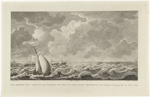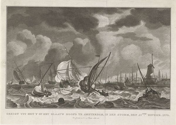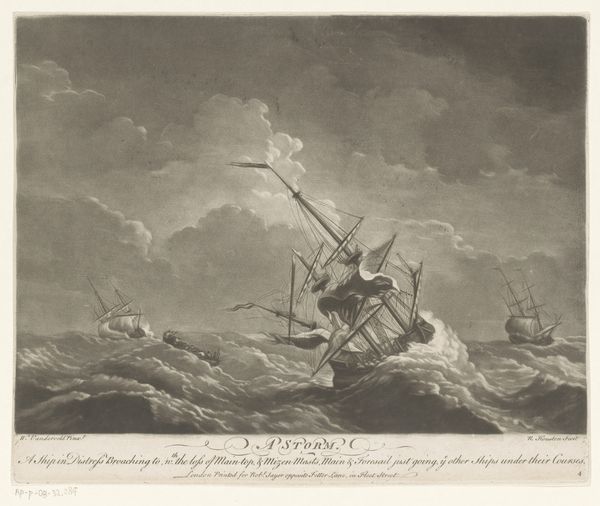 Richard Houston created this mezzotint, "Marineschepen op hoge golven," sometime in the 18th century. The tonal gradations, achieved through the mezzotint technique, plunge us into a scene of maritime turmoil. Angular lines of the ships and turbulent waves create a palpable sense of instability. Houston's composition uses these formal elements to communicate beyond mere representation. The ships, tossed about and struggling against the forces of nature, echo broader philosophical concerns. The scene suggests the precariousness of human endeavor when faced with the sublime power of the natural world, something which was particularly resonant during the Enlightenment when there were shifting perceptions of the relationship between humanity and nature. The monochromatic palette reinforces the somber, reflective mood. In this light, Houston's work operates on a symbolic level, inviting the viewer to contemplate the limits of control and the inevitability of natural forces.