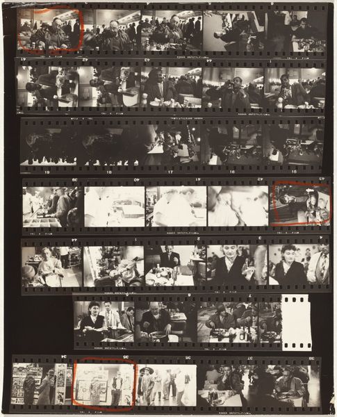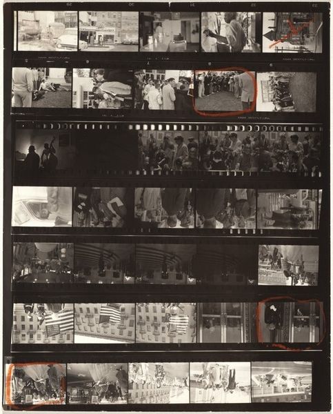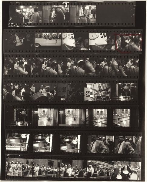 Curator: This is Robert Frank’s “Convention 16,” a gelatin silver print made in 1956. Editor: The first thing I notice is the contrast between order and chaos. The arrangement of the contact sheet provides a rigid structure, but the images themselves seem to capture spontaneous, perhaps even haphazard, moments. Curator: It is a work from Frank's series “The Americans”. Consider the period. Post-war prosperity was being questioned and captured with gritty social-realism, rejecting the ideal of the perfect image to show more about the material conditions that allow some to prosper, at the cost of many others. Editor: Visually, the high contrast reinforces this mood. The deep blacks create a sense of mystery, bordering on the melancholic, emphasizing the rough texture of the materials and film used to capture the scene, drawing the eye to formal relations within the scenes themselves. There is a tension in the forms that emphasizes the tension present within the scenes portrayed. Curator: His subjects weren’t movie stars. They were everyday citizens during the post-war economic boom, living within complex and sometimes oppressive systems. The format mirrors the industrial assembly-line process of that moment; the photo medium captured as it relates to capitalist culture and political production. Editor: Yet there is artistry in his choice of composition. He isn't simply documenting; he's arranging visual components that, in many cases, serve to abstract moments or people by way of shadows and obscured framing. Curator: Absolutely, and even his method reveals process—from choosing film stock, to developing it, printing, and how he made this as a commentary on the burgeoning American political machine that demanded conformity while processing humans as automatons. Editor: I think focusing on the surface materiality provides us entry points into interpreting broader implications, social ones included. Thinking more simply of balance, contrast, tone, one can have an almost visceral reaction to the works portrayed, a visual poem if you will. Curator: True, these raw and, at times, imperfect photos exposed some truths, even then, about that period, while reflecting a perspective of labor involved in production, a moment of mass conformity—highlighting issues present in contemporary socio-economic landscapes that carry echoes to the present day. Editor: In that sense, it offers an invitation for close inspection that resonates, I think, beyond its sociohistorical context.