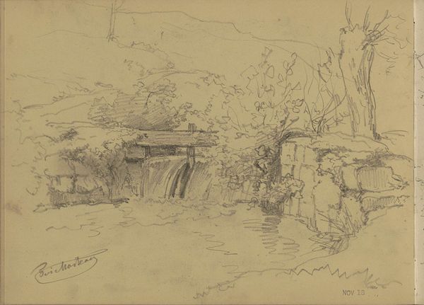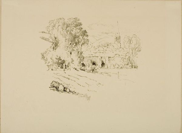 Editor: So, this is "Garden, Hotel des Temples, Girgenti, Italy," a pencil drawing by Denman Waldo Ross. It feels like a fleeting impression, almost like a memory fading at the edges. What do you see in it? Curator: It whispers of a quiet moment, doesn't it? That sketchy quality lends it a dreamlike feel, like trying to hold onto something beautiful that's just out of reach. The light seems to dance across the page, hinting at the warmth of the Italian sun. What do you make of the composition? Editor: I think the way the building is nestled amongst the trees, it feels harmonious and serene. Curator: Yes, exactly! And those unfinished lines invite us to fill in the blanks, to participate in the act of creation. It's not just a picture of a garden; it's an invitation to wander through it ourselves. Editor: That's a lovely way to put it. I'll look at sketches differently from now on. Curator: Me too! There's a certain magic in the incomplete, isn't there?