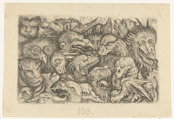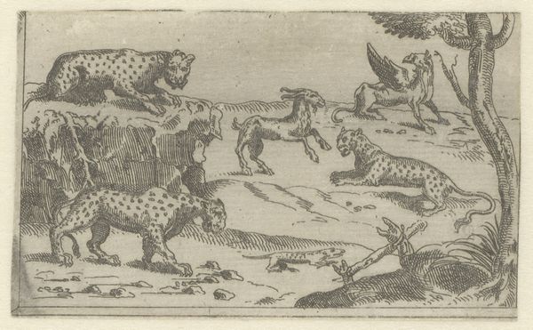 This is a print of "Two Leopards, Two Lions, a Deer and a Bear" by Stephan Herman, and its dimensions emphasize intimacy. The etching’s composition is spatially divided. The foreground features grouped animals rendered with cross-hatched lines giving them texture and mass. A background of delicately etched foliage leads to a distant landscape with buildings. The animals dominate the space, each carefully rendered in a static tableau. The composition is both ordered and slightly unsettling, using a semiotic system of animal representation to disrupt traditional hierarchies. The animals are not interacting, but arranged, undermining the natural order. The detailed lines give the animals volume while the cross-hatching shows Herman’s grasp of form. This technique makes the image both visually appealing and conceptually provocative, challenging viewers to reconsider how art can destabilize established meanings.