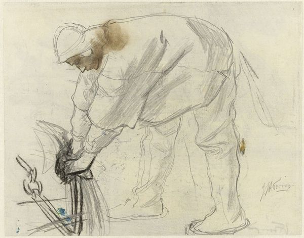 Curator: Gesina ter Borch, before 1660, gifted us this intriguing work, "Vrouw te paard, van opzij gezien, met schetsje van een onderbeen en voet," currently residing at the Rijksmuseum. It's a pen and pencil drawing on paper. Editor: Immediately, there's a whimsical, almost playful air about it. The sketchiness gives it an intimate, immediate feel. It’s not about rigid representation, but the suggestion of movement and form. Curator: Absolutely. As a study, we can glean into Ter Borch's artistic process, examining her application of line and shadow. The paper itself becomes part of the story, showing its age. What ink was used? Was the paper handmade? Editor: Right. Looking closer, though, who is this woman? The equestrian portrait has historically been used to project power, specifically masculine authority. So, a woman depicted this way – especially rendered by a female artist – challenges traditional notions of gender roles and class. How subversive was it for a woman to portray another woman taking on this traditionally male symbol? Curator: Indeed, we must consider the role of women within artistic production during the Dutch Golden Age. Access to certain materials or patronage would have been governed by societal restrictions and access to artisanal knowledge of how inks were manufactured. Editor: We can consider if the loose underdrawing reflects the restrictions placed on female artists, a space where a certain type of freedom flourished precisely because it wasn't intended for public display or sale. It’s a glimpse behind the scenes. And, who was the model? Was she from a higher social class? It prompts so many questions. Curator: It truly does. Looking at it materially, you can tell the horse's movement is captured economically with brisk strokes of graphite while her dress displays cross-hatching adding dimension and suggesting heavier material. Ter Borch makes artistic decisions to highlight her social position through the very fabric itself. Editor: So well said! And those details – the horse’s decorated harness and her confident bearing, all these details push us to explore not only how it was made but why. It challenges conventional portraiture while implicitly questioning societal expectations around gender. Curator: Thinking about the materials and her place in the Dutch art world offers such a fuller understanding of her work here. Editor: And framing that through her gaze adds a complex social and historical dimension.