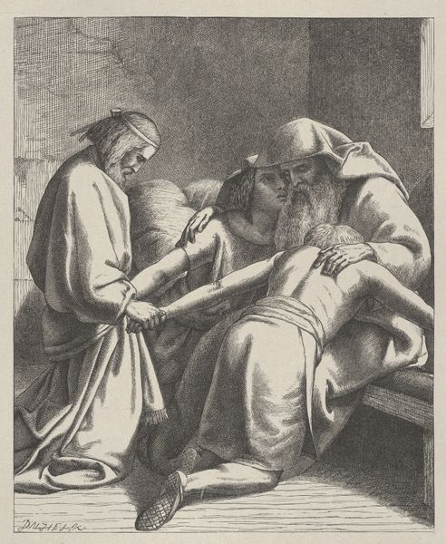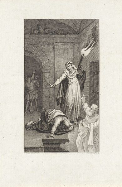 Editor: Oh, this gives me goosebumps. Look at that shame! It's palpable. Curator: Indeed. What we're seeing here is Carl Bloch's "Christ and the Doubting Thomas," an etching dating back to 1882, currently held at the SMK, the National Gallery of Denmark. Editor: Right, the old testament story. So Thomas here has literally gone to ground. All fetal and mournful. The cross-hatching technique used really amplifies his distress. Like little jabs of conscience! Curator: Bloch's realist style aimed for emotional accuracy. Consider the era; rising secularism questioned religious narratives. So how does Bloch respond? He emphasizes the deeply personal moment of revelation, right? Editor: By showing the before, the AFTER of that famous moment. Thomas *kneeling* after finally poking at the evidence. Everyone forgets this part; it's heavy with regret and surrender! Like a stage play. What about this Thomas that speaks to audiences still? Curator: It hits so hard, doesn't it? The focus isn't the miracle but the aftermath of doubt, repentance. Editor: In a world moving away from the absolutes of faith and towards human-centered rationality, maybe we all can't help but feel a bit like Thomas... wanting hard evidence of something to grasp in all the dark? Curator: Perhaps it is precisely because faith demands surrender and submission—often fraught within power structures—that an artwork like this gains traction and significance today, speaking to us still. The doubt is key. Editor: Yeah, in every sense, right? Without it the real light loses its resonance. I can really see that struggle in the print. Curator: Definitely an interesting narrative for its time. Editor: Absolutely. Well worth a contemplation for ours.
