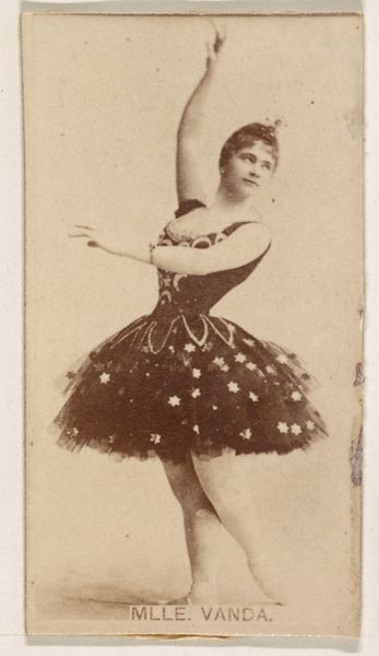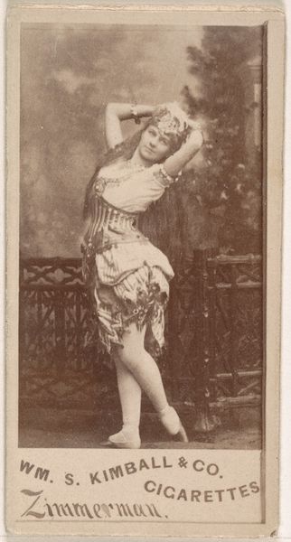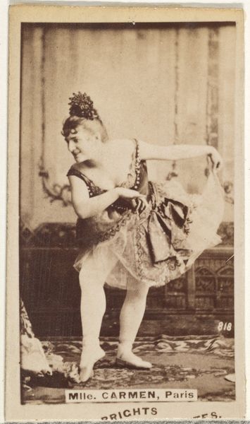 Curator: Here we have a fascinating example of late 19th-century advertising art. This is a portrait card, part of the "Actresses" series, issued around 1890 by the Kinney Brothers Tobacco Company. The goal? To promote their Sweet Caporal Cigarettes. The subject is Mme. Majori, a woman known primarily for performing in the theatre. Editor: It's all curves and light. There is such a theatrical contrast to her garb and poses. The textures, though flattened by the print medium, appear soft and flowing. I am intrigued by the lace on her arm contrasting with the dark bodice she is wearing. Curator: Indeed. The mass production of these cards was directly tied to the rising popularity of both photography and mass media. The cards served a dual purpose: they fueled celebrity culture by presenting actresses as glamorous figures, while simultaneously driving sales for Sweet Caporal. Consider how it reflects broader societal trends where the working lives of women became fodder for marketing. Editor: Thinking about the photograph strictly, I find that this piece works on its contrasts, it highlights soft textures with bold silhouettes; its use of sepia tones against the bright white background lends a dreamlike quality, almost as if Madame Majori floats. Note, too, the delicate dance she's doing with her hands as they tug at the air and her skirt. It conveys a light sense of whimsy. Curator: Right. The imagery taps into a sense of aspiration and entertainment tied into the societal perceptions of women. An actress in that period existed at a different, visible station. In purchasing these cigarettes—and collecting these cards—consumers weren't merely buying tobacco. They bought a piece of that aspirational lifestyle associated with theater and glamour. This also highlights the blurred line between art, advertising, and the performance of identity at the time. Editor: That perspective reveals more than is visibly expressed through its texture, lines, and medium alone, providing viewers more than meets the eye. Curator: It's precisely this blend of cultural commentary and visual representation that makes the piece so interesting. Editor: For me, this little window into a bygone era has given me cause to contemplate the role of performance and image as they mix.