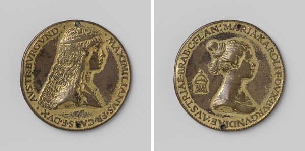Editor: Here we have a guild badge from 1662. The material appears to be metal. It is identified as “Schoenmakers-, huidenvetters- en leerverkopersgilde van Middelburg, gildepenning met no. 31.” This relief has such texture. It feels weighty, substantive, almost imposing given its evident age and craftsmanship. What strikes you most about its formal qualities? Curator: Consider how the raised relief structures the surface. Notice the concentric circles created by the lettering around the central motifs. These guide the eye and create a sense of formal order and hierarchy. Observe how the objects depicted—tools of the shoemaker's trade, symbols of their craft—are arranged not naturalistically, but according to compositional balance and symbolic weight. Editor: So the tools aren’t randomly placed but deliberately arranged for visual impact? Curator: Precisely. It is evident that this medal transcends mere functionality. The Baroque style lends dynamism and richness to this piece, evident in the use of dramatic curves in the text and stylized objects. Does that approach change your impressions of it? Editor: It does. I was seeing it just as a historical marker, but now I recognize the sophistication in its design, it's more than just the function. So what makes the coin more about visual interplay of the shapes? Curator: A study of art's intrinsic properties like this gild badge reveal aspects of balance, form, symbolism within craft traditions and a larger network of aesthetic strategies. Ultimately, form illuminates historical function but isn’t enslaved by it. It can transform our understanding into richer insight, wouldn't you agree? Editor: Absolutely. Thinking about the balance, lines, and shapes has revealed so much more about how to view works that contain detailed iconography. Thank you.
