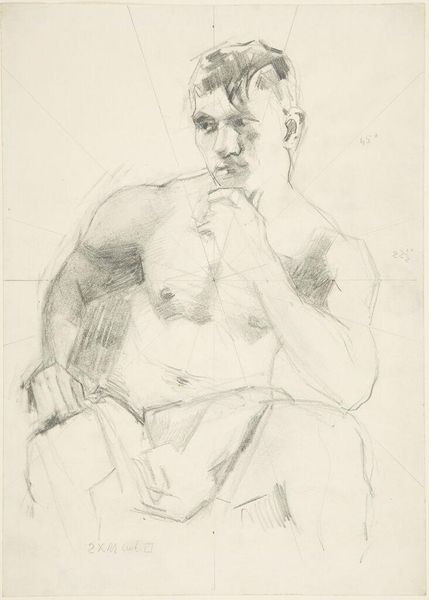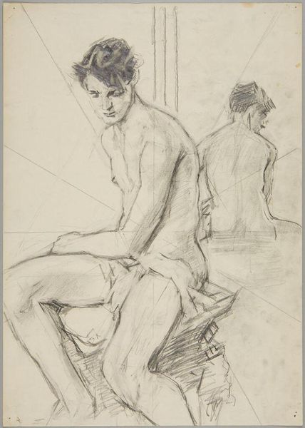 Curator: There's a remarkable vulnerability in this charcoal sketch. It's intimate, almost as if we're intruding on a private moment. Editor: This is Denman Waldo Ross's "Seated Sketch of Charlie Parker," from May 30, 1934, part of the Harvard Art Museums collection. Ross was deeply interested in artistic theory and design. Curator: The geometric lines in the background create an interesting tension with the organic form of the sitter. It hints at the societal frameworks against which individuality is expressed. Editor: Note the quick, almost frenetic lines. The sketch captures a sense of immediacy. I feel the cultural associations of youth and physical perfection. Curator: I'm struck by how this seemingly simple sketch embodies complex dialogues about representation and the male gaze within the context of early 20th-century art. Editor: It's a glimpse, a moment captured, and yet it resonates with enduring themes. A beautiful reminder of art's ability to transcend time. Curator: Indeed. The layers of meaning in such an understated piece encourage reflection on the very act of observation.