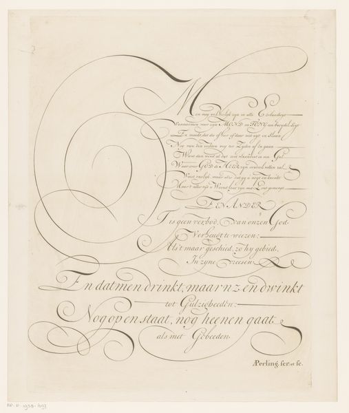 Curator: I find this piece just radiates elegance, like a carefully penned letter sealed with wax, holding secrets only those who truly pay attention can decipher. Editor: Indeed. What strikes me initially is the curvilinear quality of the calligraphy. Ambrosius Perling's "Schrijfvoorbeeld: Kvond een ontstelde Paap (...)", created between 1667 and 1718 using ink on paper, exemplifies baroque calligraphy's emphasis on elaborate form. The work feels balanced by its heavy swirls, like counterweights pulling each other toward an internal harmony. Curator: Harmony is exactly what it feels like! I could stare at the letterforms forever, I can almost feel the writer lost in a beautiful daze, pouring out feelings onto parchment... I can smell the ink from here! Editor: Focusing on those letterforms: note how Perling employs thick and thin strokes, lending dynamism. Observe, too, the generous loops and flourishes, which simultaneously guide the eye and ornament the textual content. Curator: You are right about it "guiding the eye", this thing is carefully constructed and has clearly undergone iteration after iteration before feeling right. Tell me more about that Baroque sensibility in the piece, which is what I would expect based on the timeframe. Editor: Certainly. During the Baroque period, there was a focus on ornateness and complexity in art as well as, here, script. Think of it as an assertion of skill: calligraphy transformed from mere writing into high art through sheer virtuosity. It's visual theater. Curator: "Visual theater," exactly. Each curl is a tiny performance! For me, there is a dance with precision meeting abandon. In these flourishes, and the darkness of ink on paper, lies pure artistry, a rebellion against stark practicality. Editor: On reflection, I find the dialogue between rigidity of structure and that flamboyant expression unexpectedly moving. Curator: Precisely. A disciplined release. It whispers to us about an earlier period when calligraphy wasn't only a record, but an experience. A beautiful one at that!