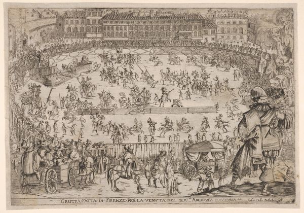 Curator: We’re standing before Romeyn de Hooghe’s engraving, “Praalbed en lijkstatie van Amalia van Solms, 1675," depicting the funeral procession of Amalia van Solms. It's quite a sight, isn’t it? Editor: Striking, yet grim. All those figures meticulously rendered in line. It speaks volumes, doesn’t it, about the spectacle of power, even in death? And look at all the coaches… the scale is immense. Curator: Indeed. De Hooghe has really captured the opulence of the Baroque, haven't they? The detail in the funeral bedchamber alone is incredible – the drapery, the symbols... all point to status and lineage. I almost feel the chill in the air, despite it just being a print. Editor: And printed for whom? This wasn't just art for art’s sake. This was mass production, aimed at circulating a specific narrative, cementing a certain image of the deceased and the continuing power of her family. How many hands were involved in creating and distributing this image, and what were their roles? Curator: That’s a vital perspective. It reminds us of the skilled craftsmanship, not just in De Hooghe’s artistry but in the printing process itself. You feel the labor, the technique involved with the engraving, right? Think about the artisan painstakingly carving into that copperplate... It makes the work breathe. Editor: Absolutely, from the source of the paper, to the ink, to the press itself and the bodies who operated it... each element leaves its trace. But what I keep coming back to is the almost absurd contrast: such immense, material wealth displayed at the very moment of loss. Did no one question the implications, I wonder? Curator: It does trigger reflections. Beyond just historical document, maybe this image tries to teach us something about acceptance, the theatrical, fleeting nature of grandeur? Amalia van Solms certainly made an impact in her time. Her legacy, now, also resides in how she continues to inspire us to think critically about her context. Editor: Precisely. It's an object deeply embedded in the complex networks of material culture. That collision, between private grief and public performance, renders it endlessly intriguing.