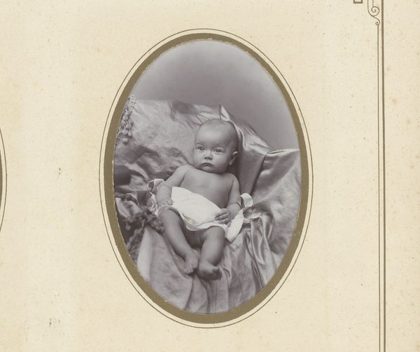 Curator: This charming image, titled "Portret van een peuter," or "Portrait of a Toddler," comes to us from the artist J.W. Wentzel, and is dated 1901. It is a genre painting rendered, quite remarkably, as a photograph. Editor: My first thought is of softness. The muted tones and oval framing give it the air of a keepsake, tender and fragile. The textural contrast of the baby against what appears to be a fur blanket also emphasizes this impression. Curator: The photograph's sepia tones imbue the image with a sense of nostalgia, echoing late 19th-century photographic portraiture conventions. Placed against a fur-like substance, the image almost reads as a cherubic symbol of innocence. Editor: Yes, but what's fascinating is how the soft focus simultaneously obscures and reveals form. The photographer hasn't emphasized the lines of the baby's features; instead, we get an ethereal presentation that highlights the intrinsic nature of childhood. This treatment speaks to the artistic conventions of rendering timeless themes through classical composition and tone. Curator: Exactly! The choice to pose the toddler amidst soft textures is, I believe, highly deliberate. The softness, visually echoed by the sepia tone, reinforces cultural concepts of childhood—a time perceived to be safe, nurtured, and tender. These sentimental symbols continue to influence contemporary portraits of children even today. Editor: I see what you mean. The composition’s visual language allows the portrait to exist almost outside time. And although it looks like a simple genre painting in photographic form, it provokes consideration of artifice in even candid imagery. It seems like an interesting play between revealing and obscuring. Curator: A wonderful paradox to capture. This piece is a remarkable echo of cultural memories embedded within visual codes. Editor: Indeed. What appeared as a straightforward genre scene really invites contemplation on so much more!
