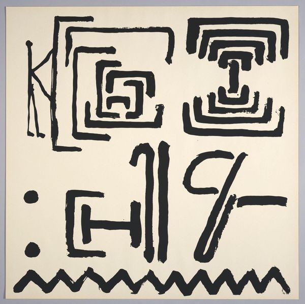 Editor: This untitled work by A. R. Penck at the Harvard Art Museums is striking in its simplicity, just black paint on paper. It feels primal, like ancient cave paintings, but also very modern. What symbolic meanings are embedded here? Curator: The power of this work lies in its use of archetypal symbols, which transcend specific cultural boundaries. Do you see the figures at the bottom? They are reminiscent of early human representations, perhaps invoking a sense of collective memory or universal human experience. Editor: Yes, they almost look like they’re running. Is that something to do with the meaning? Curator: It could be flight, or perhaps the eternal human pursuit of something just out of reach. Consider the prominent, maze-like head— what do you think it suggests? Symbols resonate on many levels, triggering different interpretations. Editor: It's intriguing how these basic shapes and figures evoke such complex ideas. It makes you think about shared human experiences across time. Curator: Precisely. The artist invites us to engage with a visual language that predates written language, accessing a deeper, more intuitive level of understanding.