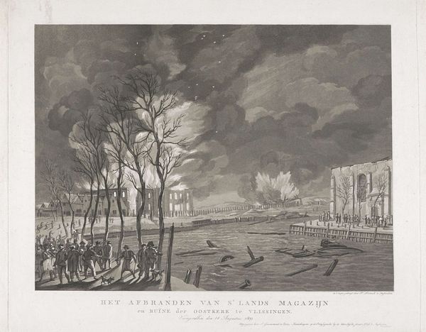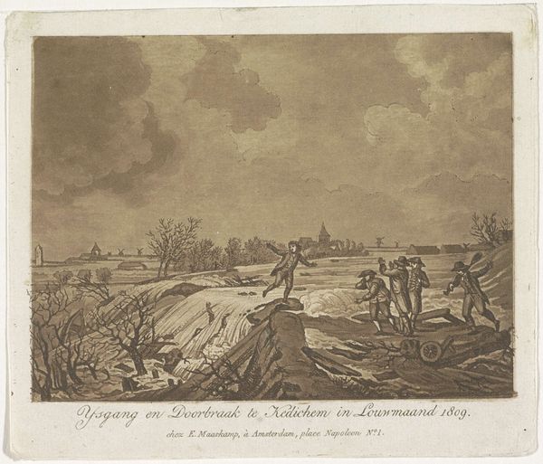 A. Lutz made this print titled 'Doorbraak van den Arkelenschen Dijk bij Kedichem in Louwmaand 1809' using an unidentified technique. The image captures the Arkelen dike breach near Kedichem during the cold month of January in 1809. It is difficult to ignore the stark exposure of communities to natural disasters, and the socio-economic inequalities of the time which exacerbated the impact on the most vulnerable. We see a group of people, perhaps a family, including a child and their dog looking out towards the disaster. Consider the power dynamics at play, who had the resources to rebuild, and whose voices were marginalized in the aftermath? The print serves as a historical record and prompts reflection on our relationship with the environment, and our responsibility towards those affected by environmental crises. It resonates with contemporary concerns about climate change and social justice, reminding us of the human cost of environmental disasters.