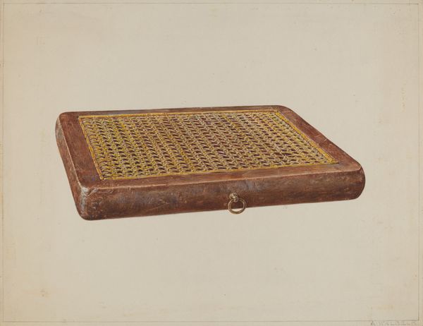 Curator: Right, let’s dive into this captivating watercolour illustration, aptly titled "Toleware Bread Tray". It’s attributed to Mildred Ford and believed to have been created sometime between 1935 and 1942. What strikes you about it initially? Editor: Hmm, there’s a curious charm about it— a mix of rusticity and festive energy, wouldn't you agree? It reminds me of my grandmother's kitchen... well, maybe not quite! Still, there’s this feeling of home-spun artistry married with...utility, I suppose? It’s making me think about painted trays with baked goods ready for harvest festivities, maybe a vibrant display of a traditional table setting. Curator: Absolutely. Toleware, as a style, connects deeply to vernacular craft traditions, where painted metalware became a common sight in households, carrying both functionality and symbolic decoration. Notice how the choice of color isn’t arbitrary. The earthy browns anchor us to natural pigments, yet are punctuated with bursts of bright yellow and crimson red. Editor: Yes! I love how these touches hint at celebratory motifs— little medallions dancing on the edge of the tray like tasty candies, bursts of life popping amidst the aged, slightly worn backdrop. It reminds me how everyday objects, if imbued with some personal craft or creative attention, turn into miniature monuments of beauty. Don't you feel it speaks to this idea? Curator: Undeniably! And beyond just aesthetics, toleware also communicates a strong sense of place and community. By visually encoding stories and histories through images and patterns, everyday items become carriers of identity, reinforcing cultural memory. Think of it as social messaging through visual vocabulary that’s always at hand. Editor: Ah, it's clever how it becomes part of the everyday rhythm, this slow kind of learning and feeling we don't often see consciously. I love that idea; I might look differently at old metal trays from now on... Imagine the stories baked into the paint itself. It suddenly makes everything feel more vibrant and textured. What a delightful find! Curator: Agreed. Exploring a piece like the "Toleware Bread Tray", helps one appreciates how something functional like a metal tray morphs into a vivid, tangible manifestation of memory. It helps me remember we often don't give enough attention to the symbols from the mundane objects we come into contact with every day!