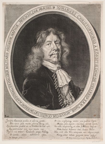 Curator: This engraving of Ulrik Frederik Gyldenløve… there’s a touch of melancholy there, don’t you think? Like a storm cloud trying to break through the official portrait. Editor: This is "Ulrik Frederik Gyldenløve," a print made by Albert Haelwegh sometime between 1665 and 1670. It definitely has a serious, almost somber feeling. All that text framing the image makes it feel pretty dense too. What jumps out at you when you look at this portrait? Curator: That density *is* part of the picture, isn’t it? Like life pressing in. It makes me wonder what stories that stern face could tell. Look closely—do you see the way the engraver captures the textures? The velvet cloak, the fur trim… they practically invite you to touch them, but that unsmiling expression holds you back. A little like a king surveying his domain. Editor: Definitely, that contrast between inviting textures and a severe gaze is interesting. It makes me think about power and representation, and how people wanted to be seen back then. Does the Latin text around the portrait tell us more about his role? Curator: Absolutely, the inscriptions around the image offer insights. "Aurant Regis per Norvegiam Vicarius” basically shouts, “Deputy King of Norway." In his own words, what do you imagine would Gyldenløve say of his service to the crown, successes, or his concerns? I wonder if he felt trapped by those titles. Editor: Hmmm, interesting, to think about his potential inner conflicts when we just see an image of officialdom! It seems a pretty elaborate image for its time. Curator: These early prints weren't just art; they were a form of social media. Imagine sending this out as a status update! What strikes me now is the lasting power of portraiture to evoke questions about who we are and who we perform ourselves to be. Editor: I see what you mean, a way of broadcasting power and status that still speaks to us centuries later. Thanks for shedding light on this, it made me appreciate what an amazing thing it is, to try and catch a real person through art!