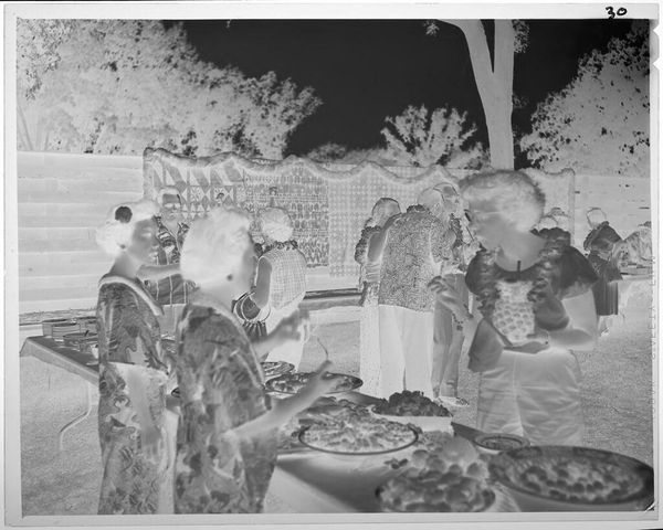 Editor: Here we have an untitled photograph of a wedding party, created by Lucian and Mary Brown. The high contrast creates a striking, almost ghostly effect. What do you see in this piece? Curator: The inverted tones immediately draw my attention. The manipulation of light and shadow creates a formal tension. Note the careful arrangement of figures and the dense, almost abstract backdrop. Editor: So, it's less about the subject and more about the composition itself? Curator: Precisely. The aesthetic choices elevate the ordinary to something more profound. The interplay of positive and negative space is particularly effective. Editor: I see it now! Thanks for sharing your perspective. Curator: My pleasure. Formal analysis reveals hidden depths.