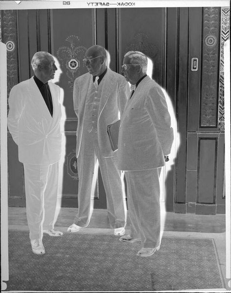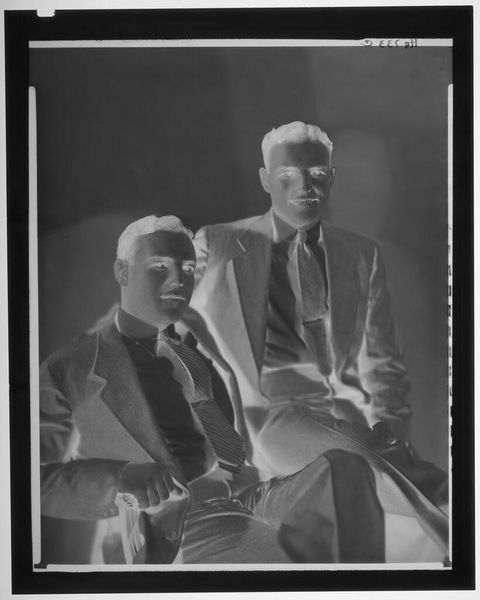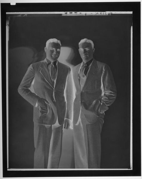 Editor: Here we have an intriguing photograph, "Untitled (two men holding trophy cup)" by Peter James Studio. It's a silver gelatin print. The reversed tones give it an eerie feel. What can you tell me about its creation? Curator: The photographic process itself is central here. Silver gelatin printing was a mass-reproducible medium. The uniformity and control the men exhibit are mirrored in the photographic standardization. What labor went into crafting that trophy, and who benefitted from it? Editor: That's a great way to put it in perspective. I hadn't thought about it that way. Curator: Thinking about the materiality changes everything.