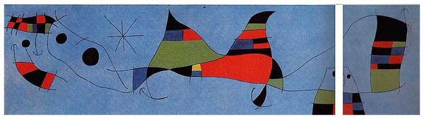 Curator: This is Joan Miró's "The Circus House," painted in 1927 using oil and watercolors. Editor: My initial thought is how strikingly sparse it is. The warm brown background feels like bare earth, and the figures, those lines and shapes, seem almost weightless against it. Curator: Absolutely, and I think that simplicity is deceptive. We see it during a key period for Miró, where he's stripping away representation to delve into pure form and feeling, moving towards what some consider his dream paintings. This was a revolutionary statement during the politically tumultuous interwar period. He moved beyond visual description. Editor: But even within that abstract language, there’s a palpable sense of materiality. Look at how the paint is layered in that backdrop, creating textures—a social commentary with visible means of production if you will, of labor and of course of his engagement with Surrealism. What do you make of his choice of earthy colors? Curator: Well, given that many saw the circus as entertainment for all societal classes, Miró seems to be deliberately confronting elite artistic sensibilities with everyday themes. Note the contrast between the ground, rustic colours and his pure geometry: is he inviting a democratic vision of modern art by uniting those perceived aesthetic oppositions? Editor: Precisely! The lines appear spontaneously applied, creating an unrepeatable dynamic between the viewer, the materials used, and even labor itself! What impact would its scale had upon his choices in execution? What did materials mean for Miró? It brings it home how intentional Miró's choices were as he embraced abstraction, inviting reflection not merely on 'what' is represented but primarily "how"! Curator: Thinking more widely, this piece, coming as it does in the late 20's just before the rise of fascism, also critiques prevailing art as the domain of elite culture: he's reclaiming ground through materials themselves. He offers us accessibility, suggesting alternatives outside conventional aesthetics. It is not mere 'Circus fun' here: there's more under the big top! Editor: In fact, revisiting it, I notice how deliberately constructed each element feels. An exploration into industrialised processes through 'the gaze'. Now I'm eager to find any preparatory sketches—revealing even deeper the narrative and method into construction from initial materials and production methods towards final abstract result!. Curator: Indeed, that material depth provides ways in, and as we look beyond aesthetic 'fun', we observe a dialogue opens. Thank you, the socio-historical approach can assist more than initially perceived.. Editor: Quite right, without understanding the social and material history in addition to historical impact any initial surface aesthetic enjoyment reduces its significance, but viewed collectively the whole transforms, gaining strength..