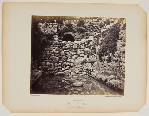 Curator: This photographic print by Robertson and Beato captures the Pool of Bethesda in Jerusalem. The monochromatic palette establishes an immediate tone. Editor: Yes, it's somber, almost ghostly. The high contrast emphasizes the ruined architecture, creating a stark, desolate landscape. Curator: Consider the historical and religious significance of the site—a place of healing in the Gospels. The ruins evoke a sense of lost potential, a fallen sacred space. Editor: The composition reinforces this. The eye is led into the darkness of those archways, only to be met with more ruins. It’s a masterful use of light and shadow to create depth. Curator: Indeed. The Pool of Bethesda, once a vibrant site of hope, becomes a symbol of temporal decay in their rendering. It’s about cultural memory as much as visual documentation. Editor: Absolutely, and technically, the way they handled the grayscale is remarkable for its time. The gradations give texture and weight to the stone. Curator: It leaves us contemplating the layers of history embedded in this place, and in ourselves. Editor: A potent, thought-provoking image.