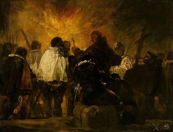 Editor: So this oil painting is called "Jan III Sobieski Hands Canon Denhoff a Letter to the Pope with the Message of the Victory over the Turks at Vienna in 1683," painted in 1880 by Jan Matejko. It's incredibly busy! There's so much going on – flags, horses, people – a real sense of movement. How do you interpret this work, especially given all its symbolic elements? Curator: It's a masterful piece of historical storytelling. Note how Matejko employs the visual language of victory: the raised flags, the commanding presence of Sobieski on horseback. But look closer, and you'll see more than just triumph. Notice how the delivered letter itself becomes a symbol. What does the act of giving, of relaying this victory to the Pope, signify to you? Editor: Well, immediately I see the power of the Church, how this military victory is, in some ways, validated or sanctioned by papal recognition. Curator: Precisely. The letter becomes a conduit, transferring the power of military might to the spiritual realm. And consider the subtle vulnerability of Sobieski in that moment of giving. He is a warrior, yes, but he seeks acknowledgement. The artist uses the cultural memory surrounding the battle, but it's layered. There’s pride, piety, but also the ever-present need for legitimization that rulers faced. The act enshrines Sobieski, yes, but is he free? Is it not a complex transaction? Editor: That's a fascinating point! I was initially focused on the immediate victory, but now I see the painting is exploring these longer-term power dynamics and how even a celebrated king must engage with established institutions. I didn't even notice all of those implications initially. Curator: It is precisely this visual language, that the painting itself is a document of history that helps us connect with its deep psychological currents. By making us consider its message, Matejko makes us consider history itself.