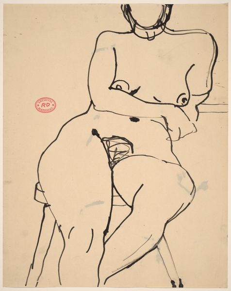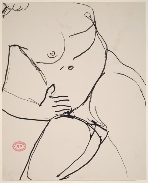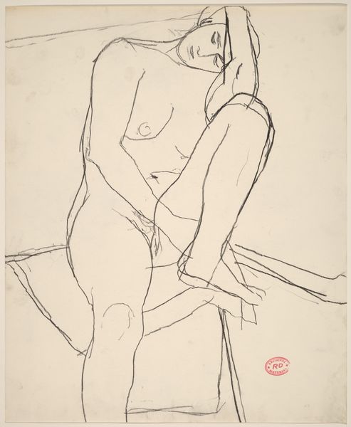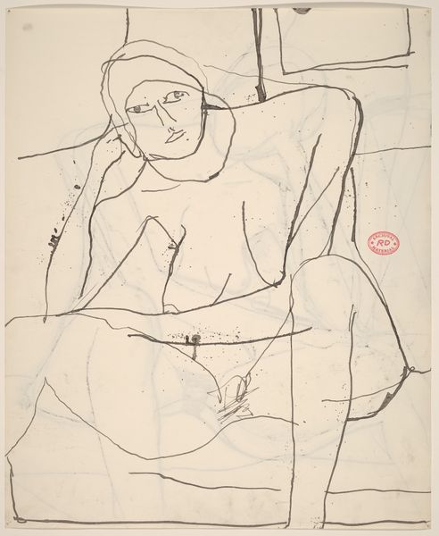 Curator: This drawing, dating from somewhere between 1955 and 1967, is simply titled "Untitled [seated nude with resting her head on her knee] [recto]" by Richard Diebenkorn. Editor: My first thought is of someone finding refuge. A moment of profound inwardness rendered with such startling economy of line. It’s almost painful, but beautiful, you know? Curator: Absolutely. And the term “seated nude” really doesn’t begin to unpack the vulnerability of this depiction. There’s such raw emotion. Consider the artistic context in which this work was made: the gendered power dynamics of the mid-20th century. How did this kind of imagery contribute or speak back to prevailing notions of the objectified female form? Editor: I'm glad you said that! There is no sexualizing happening here. The lines feel almost shaky with feeling and, you know, there's this overwhelming sense of sadness. The crossed-out or re-drawn line work gives a sense of Diebenkorn's own search. Curator: Exactly, Richard Diebenkorn was, throughout his career, keenly invested in how abstraction and representation meet and diverge. Look at the background where the previous drawings peek through, but where their meaning is less defined. We might then ask whether these fragmented depictions, or the lack of solid representation, are indicative of shifting identity, the ambiguity of experience, or perhaps even trauma. Editor: Hmmm, trauma… perhaps! It just feels really… human. Frail, even. Curator: I agree. What’s particularly interesting, I think, is the interplay between form and emotion within the history of the nude. I mean, how do artists negotiate, then and now, this visual territory that has long been shaped by patriarchal conventions? This artist offers an especially important intersectional understanding, it seems. Editor: Absolutely. It just goes to show, doesn’t it? How a few simple lines can just speak volumes! Curator: Yes, volumes about looking inward.