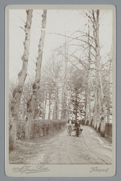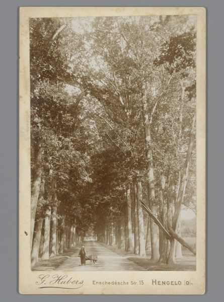 Editor: Here we have an old photograph, "Gezicht op de Middachterlaan te De Steeg," dating roughly from 1850 to 1900, created by Brainich & Leusink using the gelatin-silver print process. The way the trees recede into the distance is really striking, almost creating a tunnel effect. What compositional elements stand out to you? Curator: The pronounced linearity is indeed compelling. Note how the receding trees create strong vertical lines, framing the composition. The figures serve as strategically placed counterpoints. Their arrangement—the placement, relative size and shape— establishes a rhythmic pattern, punctuating the dominant linearity with calculated visual pauses. How does the tonal range influence your reading of depth? Editor: I see what you mean. The limited grayscale definitely compresses the space. Everything seems to flatten toward the light at the vanishing point. What impact does that have on the subject? Curator: Exactly. The restricted palette enhances the two-dimensionality. This reinforces the photograph as an object in itself rather than a mere window onto reality. Observe also the soft focus; it renders the details subservient to the overall atmospheric effect, drawing the eye inexorably toward the distant light. Are you noticing the way the pictorialism aesthetic manipulates space? Editor: Absolutely, the soft focus contributes to a dreamy, almost timeless feel, a key trait of Pictorialism. This feels deliberate. I guess the composition becomes more important than documentary accuracy. Curator: Precisely! The interplay between line, tone, and focus transforms the observed world into an orchestrated visual experience. Editor: I see how analyzing these elements unlocks so much about the artists’ intent and the aesthetic movements of the time. Curator: It enriches our viewing experience and understanding immeasurably.