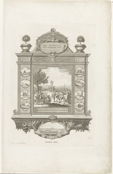 Jan Goeree made this emblem of hyssop sometime between 1670 and 1731 using engraving techniques. The linear quality inherent to the engraving process allowed for a detailed representation of the scene, rich with symbolism. Engraving involves meticulously carving lines into a metal plate, which are then inked to create a print. Here, the technique captures both the aristocratic setting and the laborers at work. You’ll notice the contrast: the fine lines elegantly depict the architectural details of the estate, while also rendering the coarse textures of the workers' clothing and tools. This contrast isn’t accidental. Goeree was likely commenting on the social order of his time. The emblem’s materiality becomes a subtle commentary on the relationship between the elite and the working class, suggesting that even in the most polished settings, labor is always present, always necessary. Ultimately, understanding the “how” of this image—the labor of engraving itself—invites us to consider the labor it depicts, blurring the lines between art and social commentary.