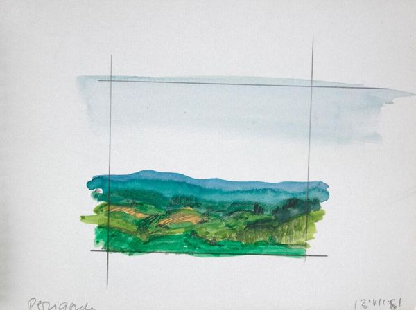 Editor: This is Elena Prentice's "Landscape," and it looks like a watercolor study. The quick, soft washes give it a dreamy, almost melancholic feel. What do you see in the way Prentice uses color and form in this piece? Curator: The composition relies on a stark horizontal division and a restricted palette. Notice how the upper register bleeds into the white space of the page, challenging the autonomy of the artistic gesture. Editor: So, the lack of defined edges contributes to its effect? Curator: Precisely. The permeable boundary destabilizes the conventional notion of landscape, reducing it to an interplay of color and texture. The two faint vertical lines further create a frame within the frame. Editor: That's fascinating; I hadn't considered the significance of the undefined edges. Curator: Considering the formal elements, one cannot help but question the boundaries of representation. Editor: I see what you mean; it pushes me to think differently about landscapes.