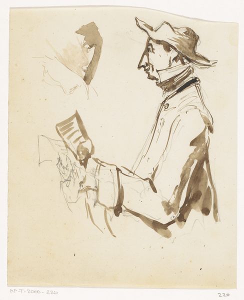 Editor: This is "Standing Figure with Hat and Staff" by Johannes Tavenraat, likely from between 1840 and 1880. It's a pencil drawing, and there's something very fragile about it – it feels like a fleeting glimpse. What do you see in this piece? Curator: I see a representation of societal power structures being subtly undermined. The sketch, with its tentative lines, portrays a figure reliant on a staff. In the 19th century, this could signify not just old age or infirmity but also dependence, perhaps even a commentary on societal roles for those marginalized, such as the poor or disabled. Editor: So, you're saying it's not just a portrait, but a statement? Curator: Precisely. Consider the period – Romanticism was grappling with social upheaval, industrialization, and burgeoning class consciousness. A figure, seemingly of authority due to the hat and cloak, but needing a staff, presents an image of weakening power, open to interpretation within these shifting social dynamics. Where does the staff symbolize support, and where does it represent instability? Editor: I hadn't considered the social context so directly, more just as an old man. It's interesting to think about it through that lens. Does the Romantic era necessarily dictate political protest? Curator: Not dictate, no, but it provides fertile ground. The focus on the individual, inherent in Romanticism, is intertwined with societal observations and is ripe for interpreting ideas of identity and challenge in the era’s rapid social and economic changes. Tavenraat subtly raises questions about power, dependence, and representation within these changes. Editor: I see what you mean. It adds layers I wouldn't have initially picked up on. Curator: Exactly! The seemingly simple image transforms into an intersectional text reflecting nuanced social concerns, which is what is so compelling to study within the realm of art history.