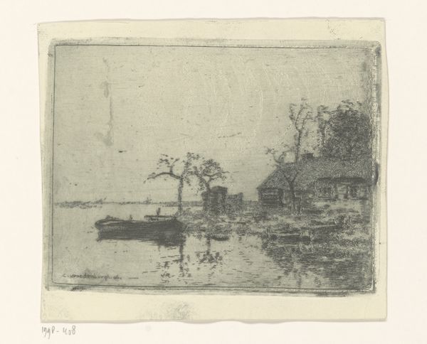 Curator: Immediately, it gives me this nostalgic, wistful feeling. All that hazy grey resolving itself slowly. Like remembering a place. Editor: This is Gustave Leheutre's "The Bridge at Fournay, from the Side," created as an etching print around 1895. Leheutre really captured the everyday in late 19th-century France. Curator: I love how the artist's mark-making actually seems to embody the flow of the water. Notice how the ripples kind of mimic the line work above it? Editor: Absolutely. He masterfully used the etching technique to depict light and reflection on the water. The social element is present, as bridges at the time fostered trade and communication and also had a growing presence in the visual arts and popular imagination. Curator: Speaking of trade and connection, there is the solitary figure in the boat, off to somewhere alone. It has an amazing capacity to draw you in, doesn't it? Almost like it could be any of us adrift in thought. Editor: It also puts in question whom this work might have been intended for. Etchings like these were bought as easily distributable imagery affordable for an expanding art market at the time, fostering discussions around city life among diverse social circles. Curator: I’d want this hanging in my bathroom or on some wall where the low light accentuates its mysteries. It's something that I wouldn't ever grow tired of looking at. Editor: In conclusion, it stands as an incredible example of Impressionist printmaking and also helps us see, reflect, and discuss its contemporary appeal as a popular medium.