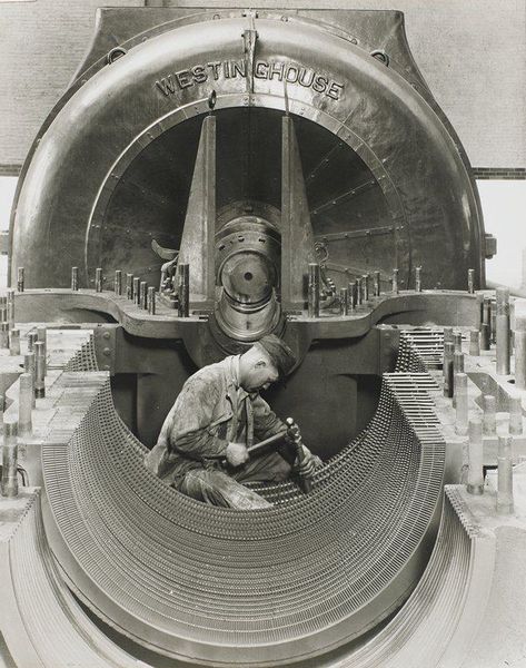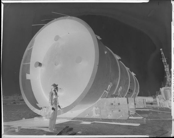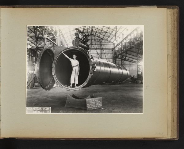 Curator: This intriguing photograph, taken by Jack Gould, is simply titled "Untitled (man next to large pipe)." Editor: It feels monumental, doesn't it? The sheer scale of the pipe dwarfs the figure, creating a palpable sense of industrial awe, and maybe even a bit of alienation. Curator: Absolutely. Gould's work often explored the intersection of human labor and large-scale construction projects, capturing the zeitgeist of industrial expansion. The worker almost disappears against the immensity of the project. Editor: I wonder about the social implications here. Who is this worker? How does his identity intersect with this colossal infrastructure? Is he empowered or rendered insignificant? It makes me consider how race, class, and gender might play into that relationship. Curator: Indeed. And considering the context of the mid-20th century, Gould's photograph, even without a precise date, speaks volumes about the socio-political landscape of labor and industry. Editor: It’s a compelling visual statement. Makes you think.