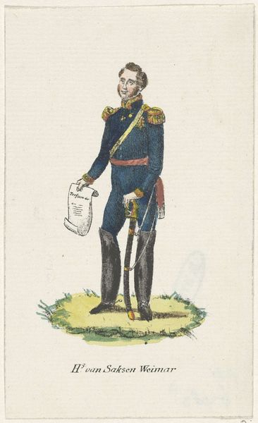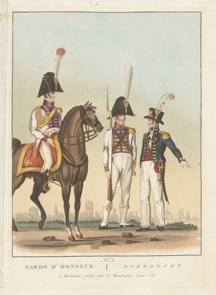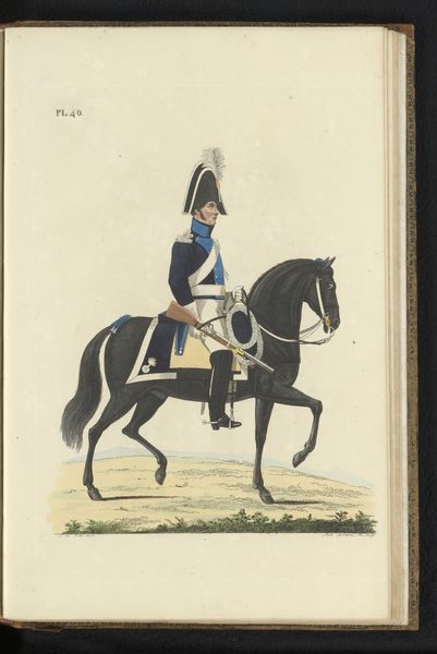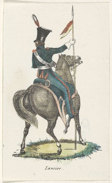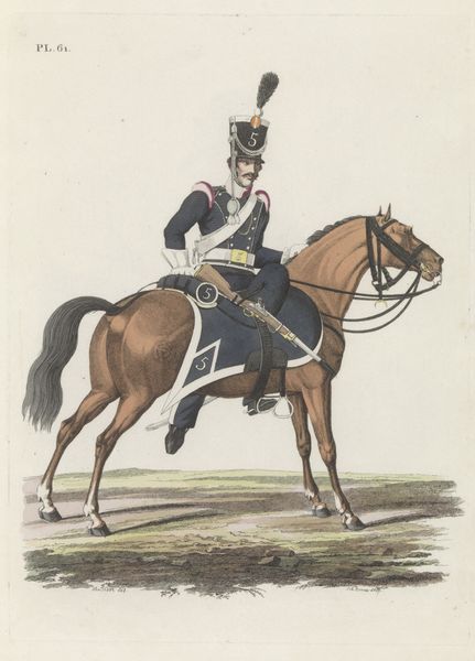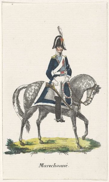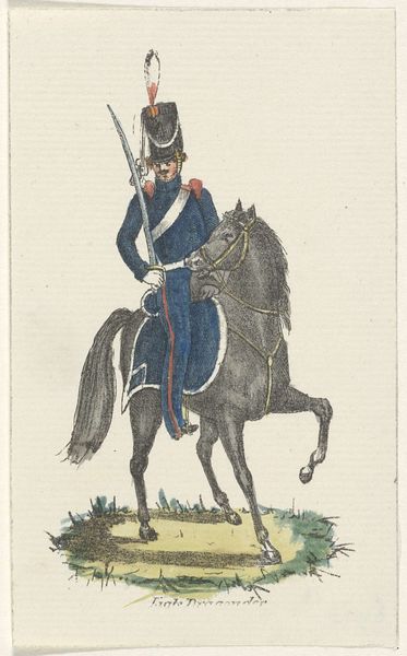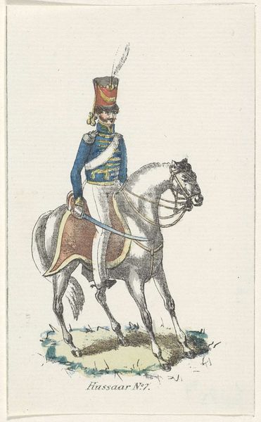 Editor: Here we have Willem Charles Magnenat’s "Rijdende Artillerie," made sometime between 1830 and 1835. It’s an ink drawing, almost print-like in its precision, portraying a soldier and his rearing horse. There's something stiff and formal about the way they're both posed. What do you make of this piece? Curator: I'm drawn to the ways this work documents the material realities of military life at the time. Consider the labour involved in producing such a detailed print – the artist's hand meticulously transferring the image, the production of the ink itself, the paper. How does the seemingly simple rendering of a soldier and his horse reflect the social and economic structures of its time? Editor: That's an interesting way to look at it, I was focused on it more as a history painting. Curator: Precisely, consider the uniform, the weaponry; each a product of industry, of specific manufacturing processes. What does the detail in rendering those elements suggest about their importance? Is it mere documentation, or does it imply a deeper commentary on the mechanization of warfare? Editor: So you’re saying it's not just *what* is depicted but *how* it's depicted? And how that process reflects broader manufacturing and labour trends? Curator: Exactly! Look closely at the horse’s bridle, the buttons on the uniform; their meticulous rendering highlights the very real, tangible nature of military equipment. This elevates the status of what we might consider craft or labour, to a central theme. Editor: I see, thinking about the production process and the materials themselves opens up a whole new perspective, not just about military life, but the labor and means to produce it. Curator: It challenges our ideas of art being divorced from the day to day materials that define our world.