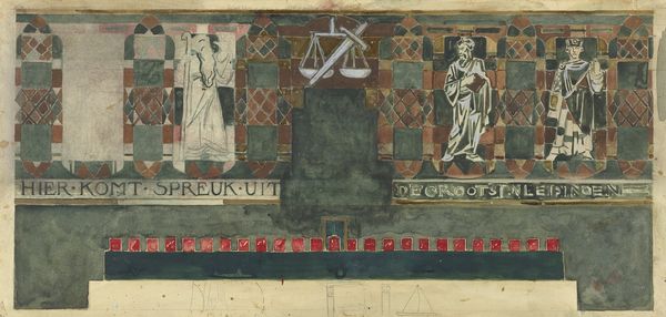Carel Adolph Lion Cachet made this design with graphite, pen and brush in the Netherlands, at the turn of the twentieth century. It shows four scenes, each framed within an arch. This artwork encapsulates the artistic experimentation of its time. The simplified figures, bold outlines, and limited color palette suggest an interest in conveying essential forms and emotions, aligning with the broader Symbolist movement, which rejected naturalism in favor of subjective expression. Cachet may have been influenced by the rise of social consciousness in the Netherlands at the time, which emphasized themes of community, labor, and collective identity. As art historians, we can explore Cachet’s social milieu by consulting archives, periodicals, and exhibition records of the time. These resources provide insight into the cultural values that shaped Cachet’s artistic vision and reflect the changing social and political landscape.