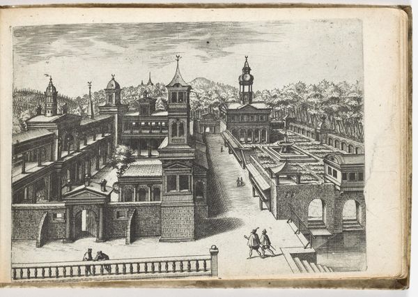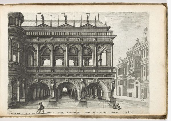 Editor: So this is "View of a Canal with a Bridge and Stairs to the Left" by Johannes or Lucas van Doetechum, created sometime between 1562 and 1601. It’s a print – an etching and engraving. There's something about the heavy lines that create such sharp contrasts; what catches your eye? Curator: It's a fascinating snapshot of civic identity. Doetechum gives us, literally, a bridge – and stairs! – to understanding Dutch cultural memory. Look closely. Does this scene strike you as wholly unique, or does it echo something deeper in the collective consciousness? Editor: I can't say that it is something that jumps right out at me. Curator: Consider how water, bridges, and the elevated perspective repeatedly appear in Dutch art and life. Waterways were vital for trade and defense; bridges symbolized connection and prosperity. Even those imposing steps could symbolize a rise in fortune. Do you get a sense that the artist saw the architecture itself carrying a deeper message? Editor: You mean that it may be a representation of societal advancement and unity, rather than merely bricks and mortar? The symbols are really there, and so overt! I would have glanced over it. Curator: Exactly! The placement of architectural elements, especially when heightened like this, contributes to how people relate to, and even move within, their environment. It subtly reinforces a sense of order, aspiration and collective achievement. Think of the light here. Is it about pure visibility, or about illuminating cultural values? Editor: That's a profound way to interpret such a seemingly simple cityscape. I see it now: this image tells a story far beyond what’s immediately visible! Curator: Precisely. By deciphering the symbolic language, we access a deeper understanding of the past and its impact on the present. I may look into more of this, myself. Thank you!