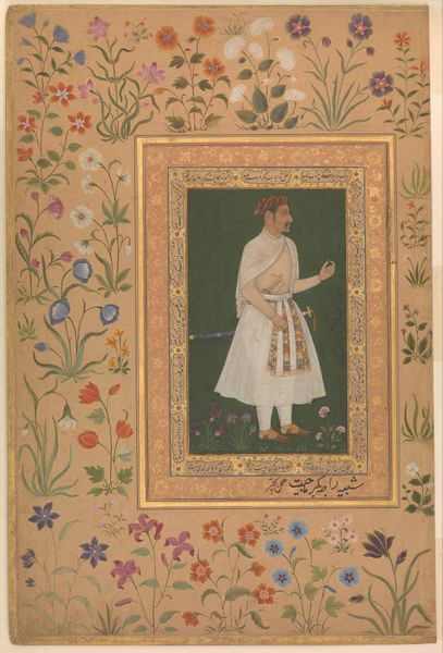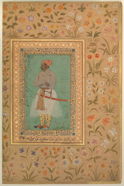 Curator: At first glance, the muted palette and the somewhat flattened perspective give this portrait a very formal, almost iconic feel. Editor: Indeed. Here we have a folio from the Shah Jahan Album, an artwork entitled "Portrait of Khan Dauran Bahadur Nusrat Jang" dating roughly from 1505 to 1665. It’s currently housed at the Metropolitan Museum of Art. What I find interesting is how it captures the intersection of imperial power and artistic patronage during the Mughal era. Curator: It's compelling how the materials themselves – watercolors on paper – contribute to the delicate quality. This wasn't about bold brushstrokes; it was about painstaking detail. Look at the layering in his garments, the subtle rendering of the metalwork in his shield. I want to know more about where these pigments originated and how they were processed. Editor: Absolutely. And consider how a piece like this circulates within the elite social structures of the time. These weren't public works; they were commissions, symbols of status meant for display within a very controlled environment, influencing perceptions and consolidating power. Curator: That makes me wonder about the labor involved. Someone spent hours, maybe days, just on those floral borders. It speaks to the availability of resources – both material and human – that allowed for this level of dedication to craft. Editor: Right, and that craft played a vital role in projecting authority. Khan Dauran wasn't just a man; he was a representation *of* power. How that representation gets made and consumed reveals a lot about the socio-political climate. His dress, his pose with his armaments; they were crucial. Curator: Examining his weapons from a materialist perspective, I also ask, are they representative, purely ornamental, or are these the same objects this individual would actually utilize in battle? Editor: And how does this specific portrait contribute to our wider understanding of the court? Think of the other figures immortalized in the album; together, they construct a carefully curated vision of the Mughal world. Curator: It strikes me that even the relatively minimal depiction of a landscape is still suggestive. What kind of message might that be sending to audiences? Editor: I find myself pondering how an image such as this functions both within and beyond the historical moment, influencing modern-day understanding of South Asian art and history. Curator: A potent reminder to appreciate both the artistry and the complex web of forces that bring an artwork like this into existence.