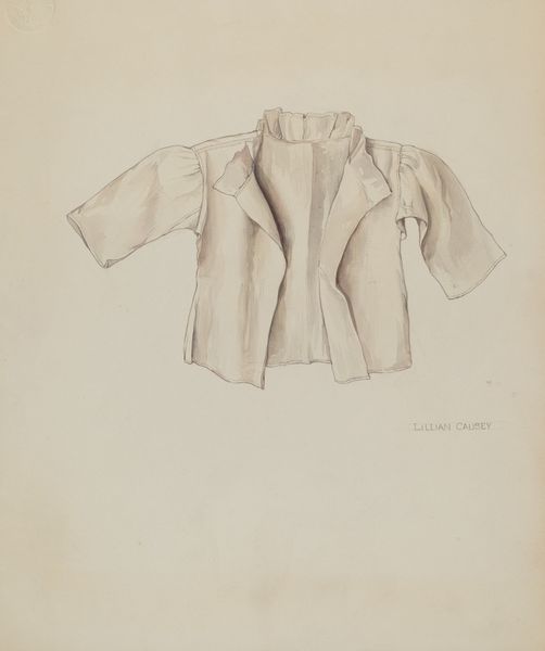 Editor: Here we have "Man's Shirt," a pencil drawing on paper from around 1936. There's a sort of quiet formality to it, even though it’s just an outline. What do you see when you look at this piece? Curator: I see more than just a shirt; I see a potential uniform, a symbol of societal expectations for men in the 1930s. It’s intriguing how such a seemingly simple garment, especially rendered as a drawing, can carry so much cultural weight. Think about the labour movements of the time, the enforced respectability during the Depression... does this shirt represent conformity or aspiration? Editor: That’s interesting. I was mostly focused on the visual elements. But now that you mention it, that ruffled part does seem… unnecessary almost. Curator: Precisely. Why that flourish in an era defined by hardship for many? The frilled details juxtapose sharply against the minimalist outline, creating a subtle commentary on class and identity. How does the drawing style contribute to this contrast? Editor: I guess the lines are very precise and technical, but the frills are also very detailed… it’s like it’s highlighting something. Curator: Indeed. The meticulous rendering draws attention to these embellishments. Perhaps the artist intended to critique the restrictive conventions of menswear, hinting at underlying tensions between tradition and individuality. Or perhaps the garment offers the wearer an escape into performance and adornment in a harsh and austere economic context. Editor: So, it’s not just a drawing of a shirt; it’s about the social and political ideas it represents. Curator: Exactly. Art offers opportunities for deep discussion about the social context around its creation. By thinking about class, gender, and power, this seemingly mundane object suddenly opens a dialogue with history. Editor: I hadn’t considered that. I’ll definitely look at drawings differently from now on.