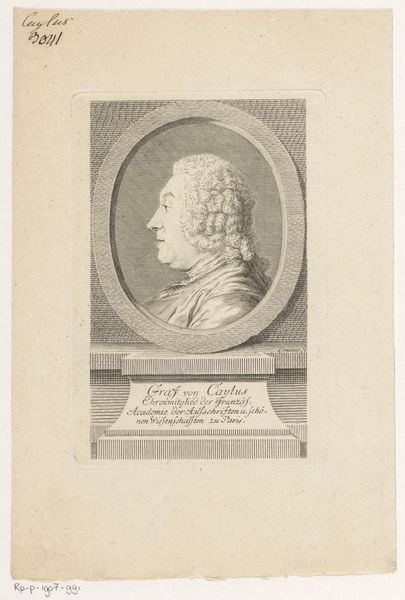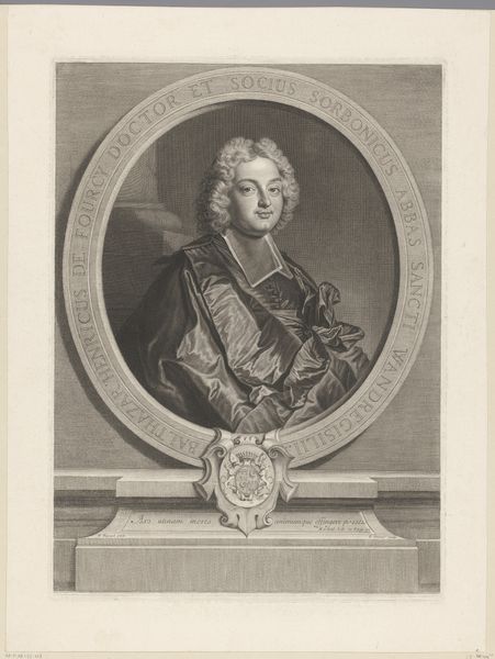 Editor: Here we have Antoine Louis Romanet's print, "Pierre Louis Dubus de Preville," dating between 1760 and 1820. It's an engraving, quite ornate. I'm immediately drawn to the contrast between the serious portrait and the playful masks at the bottom. What do you make of it? Curator: Indeed, the work compels us to consider its inherent structure. Observe how the circular frame, adorned with vegetal motifs, contains the sitter's likeness, achieving a pleasing symmetry. The composition employs a clear foreground, where the masks reside, contrasting with the more nuanced rendering of the portrait itself. This spatial differentiation invites contemplation. Editor: So, you see the masks and the portrait as distinct elements contributing to the overall structure? I was wondering if they were meant to be thematically linked somehow. Curator: Undoubtedly, their co-presence engenders meaning, but formalism prioritizes an understanding of how these components interact on a visual level. Consider, for instance, the engraving technique: the density of lines, their directionality, and the resultant tonal gradations. Editor: It is striking how much detail he managed to achieve with just lines. Curator: Precisely. Romanet exploits the potential of his medium to delineate form, texture, and light. And, observe the calligraphy -- the deliberate placement of the text at the bottom to balance the composition and guide our visual journey. Editor: That makes a lot of sense. Thinking about it purely visually, the lettering grounds the portrait, giving it weight and context. I guess I was too caught up in trying to decipher meaning! Curator: The inherent qualities are paramount. By attending to the formal elements—line, shape, texture, composition—we approach a deeper appreciation for the artistic endeavor. Editor: This has shifted how I view the work, focusing more on the intentional construction rather than my initial emotional reaction. Thanks! Curator: A close study of the image is always revealing.