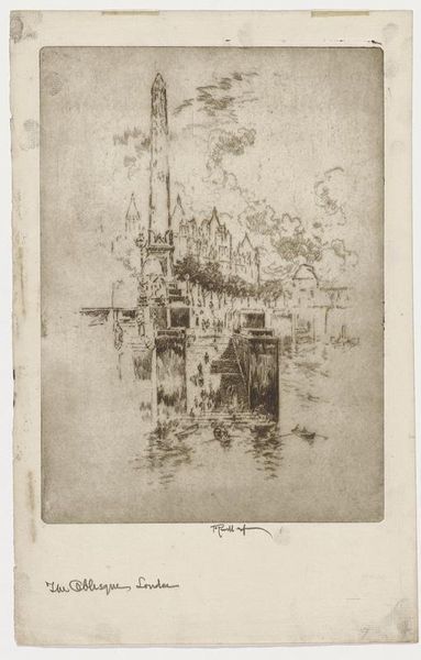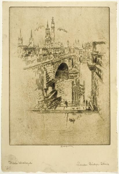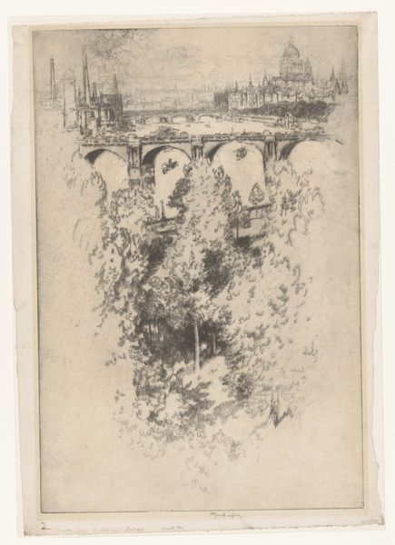 Editor: This is Joseph Pennell's "Over Waterloo Bridge, Church and Work," created around 1910. It's an etching on paper, a print. I’m struck by the contrast between the heavy industrial elements and the wispy trees. What's your take on this piece? Curator: Notice how Pennell uses etching to present a commentary on London's industrialization. The choice of etching, a readily reproducible medium, aligns with a broader availability of art, breaking from the elite patronage system. How does this medium, do you think, contribute to our understanding of labor and consumption in the cityscape depicted? Editor: I guess etching democratizes the image; it’s not a unique, precious painting only the wealthy could own. It can be widely circulated and consumed, just like the goods being produced by the industry in the background? Curator: Exactly! The visual language itself reflects a material reality. The bridge, churches and factory chimneys - elements of social production – become commodities visually consumed by the viewer, thus erasing lines between labor and leisure. Consider how he depicts these forms. Is the cathedral given same prominence as industry? What does that placement suggest? Editor: The factory is almost ghostlike but is taller than St. Paul's! So he is literally raising industry up. It is so much more prominent! Curator: Indeed. And the very labor involved in printmaking - the repetitive, almost mechanical act of etching - mirrors the industrialized labor that he represents. Could we consider the social implications of his work beyond its aesthetic value? How the conditions of making shapes meaning? Editor: So it's not just *what* is depicted but *how* it's made that gives us insight into the cultural values of the time, linking materials and class? Curator: Precisely! Considering the socio-economic dimensions deepens our insight into a work like this beyond surface aesthetic impressions. Editor: Thanks, I never thought about an artist’s technique carrying a cultural message too.