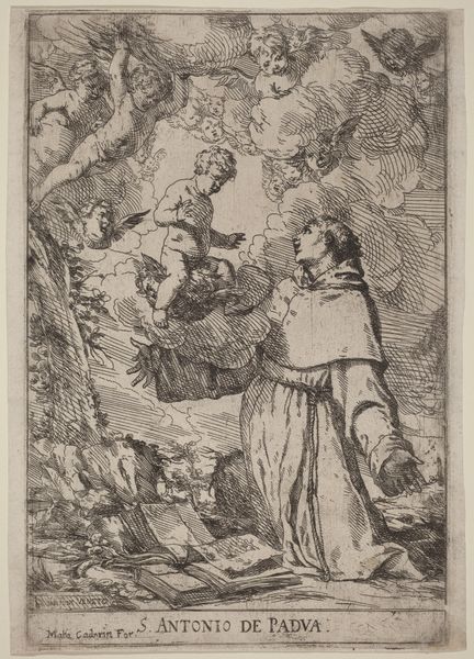 Editor: Here we have Antonio Tempesta's etching and engraving, "Expulsion from Paradise," created sometime between 1565 and 1630. It feels like a theatrical tableau, but stark, etched in decisive lines. What draws your eye, and how do you interpret this iconic scene? Curator: My gaze is immediately caught by the radiant angel. Observe the figure's posture, the accusatory gesture, the weapon held not in aggression but as an emblem of divine authority. Consider the symbol of light surrounding the angel versus the shaded figures of Adam and Eve. How might this visual language speak to a deeper, cultural memory of guilt and loss? Editor: I notice Adam and Eve seem to be actively fleeing, not just being escorted. Curator: Indeed. That fleeing mirrors our own human condition, doesn't it? A continuous movement away from perceived perfection. Consider, too, the placement of the serpent. Its placement suggests not just temptation but a foundational disruption. Think about the way a culture interprets good and evil through recurring symbols; the snake being nearly as iconic as the apple. Do you see a potential tie in there? Editor: That's interesting! I had only considered the serpent in relation to the story itself, not as a broader symbol across cultures. Its position here, low, coiled, makes it almost seem like the bedrock of the new world they are entering. Curator: Precisely! And doesn't the sharp line work, typical of engraving, almost reinforce that feeling of a world now fractured? Editor: Absolutely. I’m now considering how much of the scene's meaning relies on established visual cues beyond just the narrative itself. It makes the scene more active and connected. Curator: And that connection is the true power of iconography. Symbols offer continuity, reflecting and shaping our understanding across time.