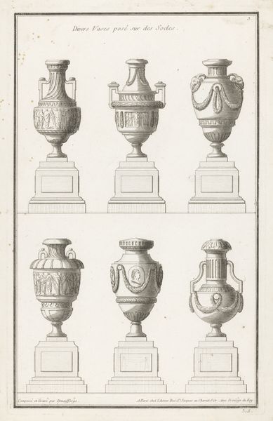 This print, "Vases on high pedestals," was designed by Jean François de Neufforge, around the 18th century. This was a time when art and design reflected society’s hierarchical structures through classical motifs. The vases, symbols of containment and display, are elevated on pedestals, underscoring their importance and the value of what they might hold. Consider what it meant to display wealth and taste during this era, when social status dictated access to luxury and beauty. Each vase is unique, yet they all adhere to the aesthetic values of the period, blending functionality with classical ornamentation. This conveys a sense of permanence and authority, ideas often associated with the ruling classes. The designs suggest a narrative about power, the role of decoration, and the careful construction of identity through material culture.