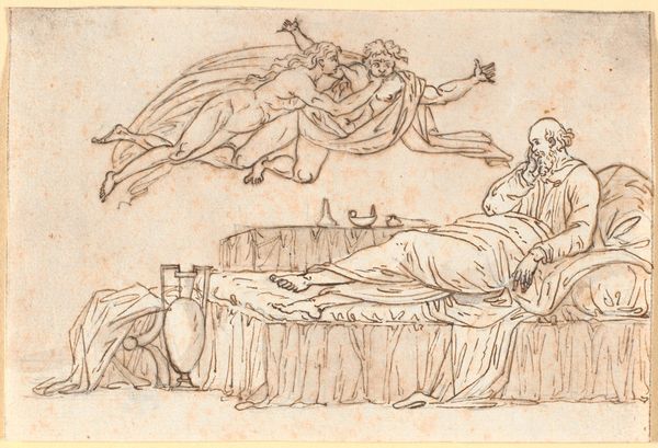 Curator: This is Nicolai Abildgaard's ink drawing, "Hyrden Faustulus finder Romulus og Remus," created between 1743 and 1809. The work is currently held in the collection of the SMK, the National Gallery of Denmark. Editor: My initial impression is a dusty sepia dream. The scene unfolds in strokes that feel both urgent and ethereal. A sort of rustic noir... what do you make of the dramatic setting? Curator: It presents a cornerstone of Roman identity. Abildgaard portrays Faustulus discovering the infants Romulus and Remus. We can contextualize it within the political function of history painting. Consider the potency of origin myths in forging national identity, and how art was a visual language through which states communicated. Editor: Ah, yes, Rome's 'once upon a time' tale— abandonment, survival, destiny. It does have this monumental air despite the humbleness of its rendering. The almost translucent figures seem both vulnerable and powerful. Did Abildgaard mean to play with these inherent tensions, you think? Curator: Abildgaard certainly knew the rhetorical power of images. Notice how the reclining figure is ennobled, while Faustulus assumes an active, heroic posture, securing the future founders of Rome. We must also reflect on how such classical themes functioned within the cultural and intellectual climate of 18th-century Europe. Editor: It’s compelling how the spare application of ink lets the narrative breathe. It doesn’t dictate emotion; instead, we’re left with this haunting spaciousness that allows us to project our own interpretations into that legendary beginning. It's beautiful, actually. Curator: Indeed. By engaging with such foundational narratives, artists like Abildgaard helped to cultivate a sense of shared European history and identity. A visual articulation of power through mythology. Editor: Power forged in a river, nourished by wolves, imagined in sepia tones. Thanks for drawing me deeper into that past. Curator: The pleasure was all mine. It's a pertinent example of history translated into image.